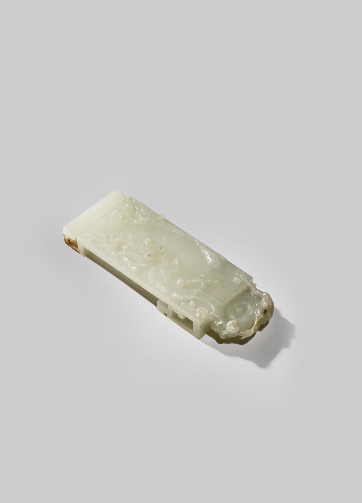 A CHINESE PALE CELADON JADE BRUSH REST QING DYNASTY Of rectangular form with scroll ends