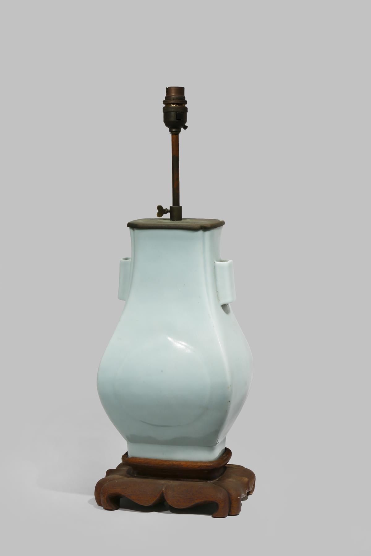 The moulded body with two lug handles, decorated with a pale blue glaze, mounted as a lamp, the vase 31cm.
