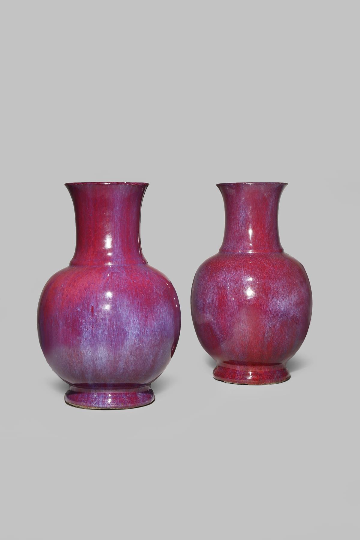 A PAIR OF CHINESE FLAMBE GLAZED VASES QING DYNASTY Each ovoid body raised on a short flaring foot