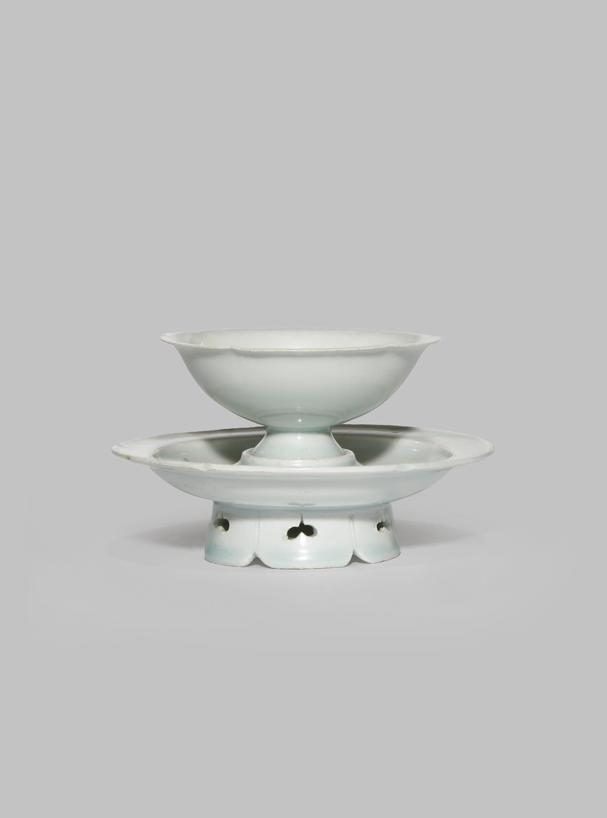 A CHINESE QINGBAI CUP AND STAND SONG DYNASTY 960-1279 AD The lobed U-shaped cup raised on a short...