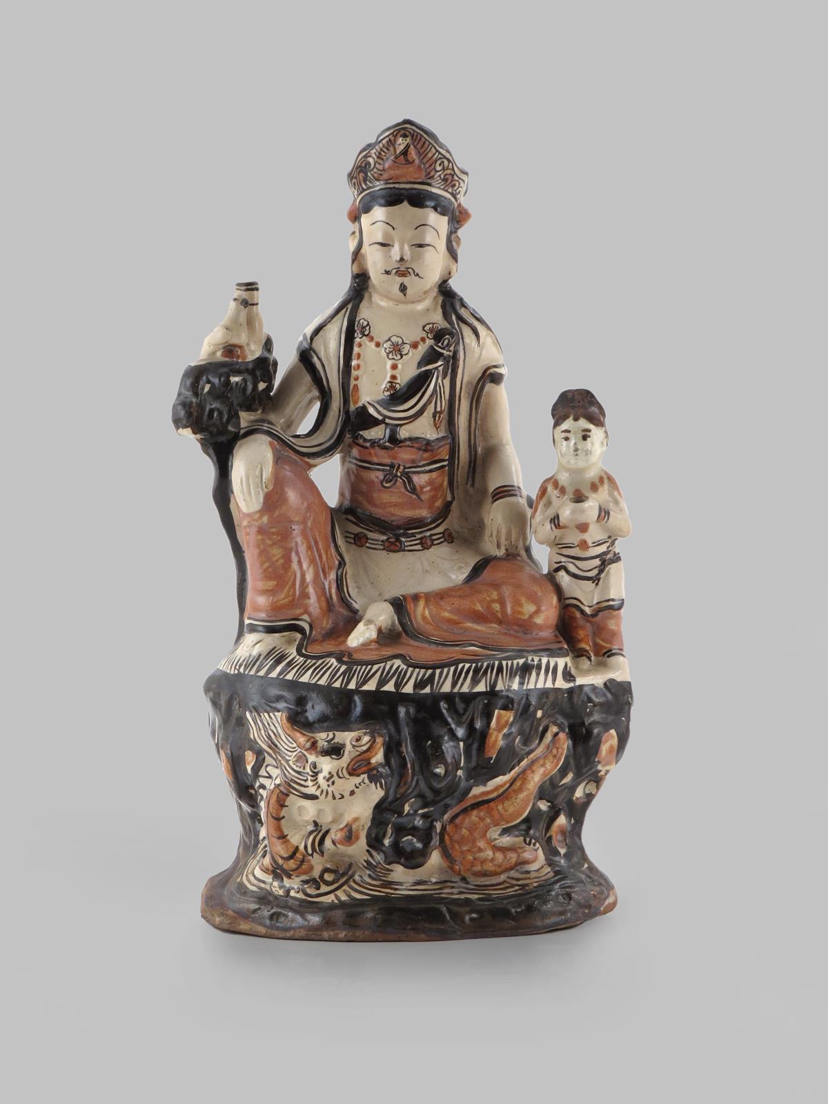 Seated on a tall rocky plinth wearing a headdress, flanked by a bird to one side, a small child holding a bowl to the other, a ferocious dragon writhing beneath, decorated in cream, brown and russet glazes, 30.5cm.