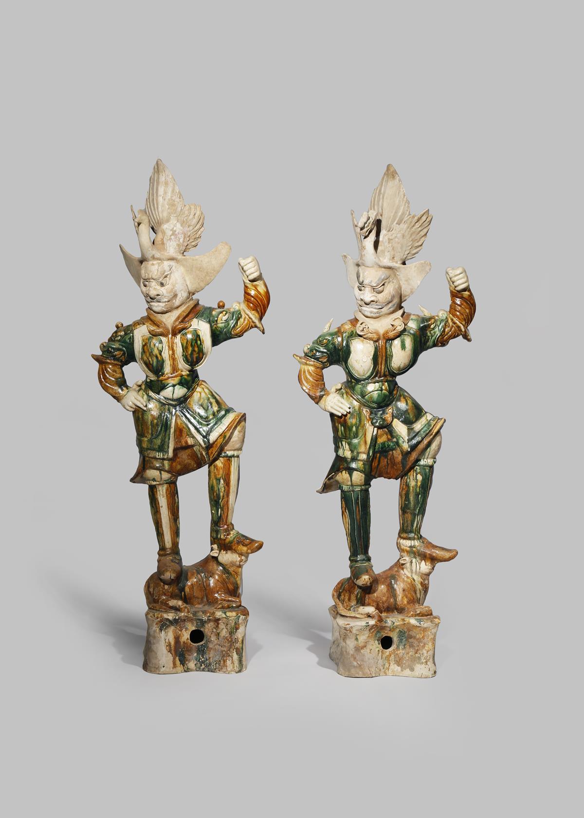 Both wearing armour and standing on a recumbent bull, each with an elaborate phoenix headdress, a fierce expression and with his left arm raised, decorated in green, amber and cream-coloured glazes, raised on rectangular bases, their facial details picked out in black, 99cm. (2)