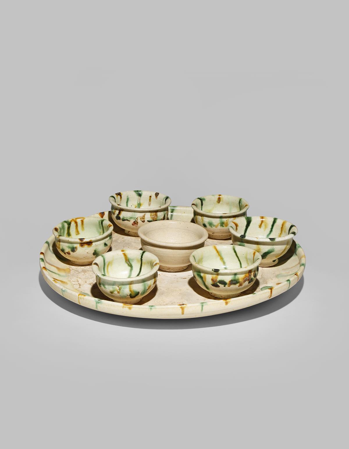 A CHINESE POTTERY CIRCULAR TRAY TANG DYNASTY 618-907 AD Together with six small U-shaped cups...