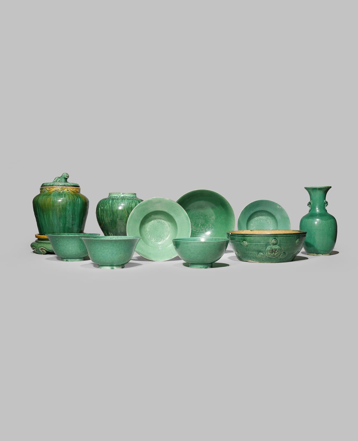 A SMALL COLLECTION OF CHINESE GREEN GLAZED PORCELAIN AND STONEWARE ITEMS MING AND QING DYNASTY...