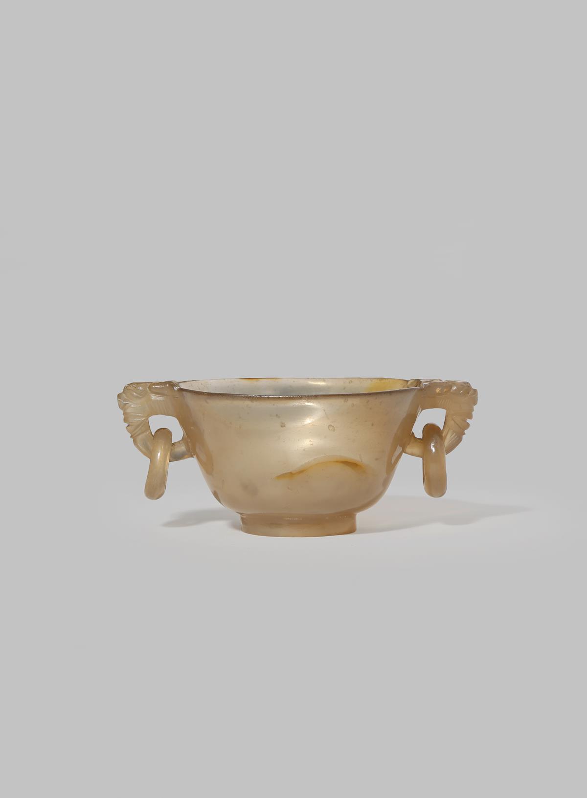 A SMALL CHINESE AGATE TWO-HANDLED CUP QING DYNASTY The gently flaring body with two animal masks...