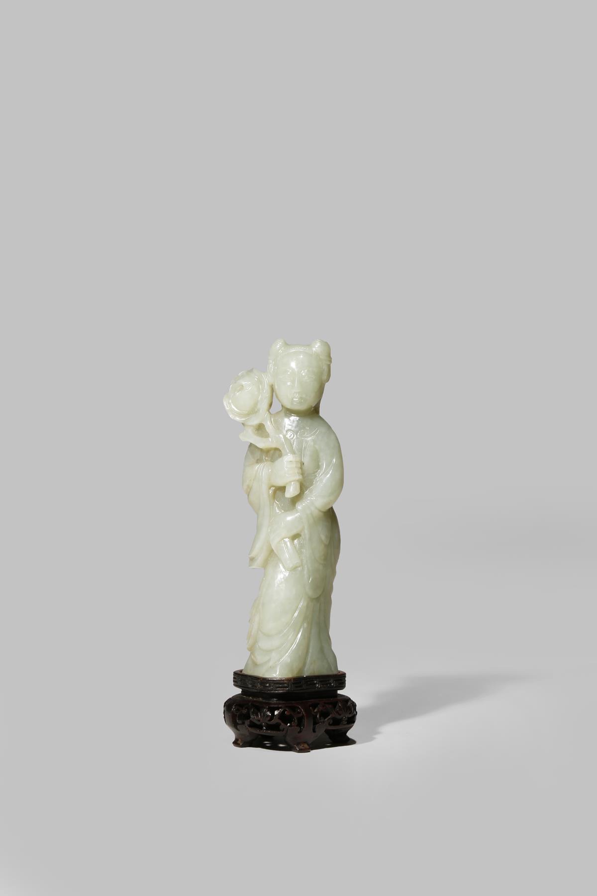 A CHINESE CELADON JADE CARVING OF A YOUNG WOMAN LATE QING DYNASTY Standing holding a large flower...