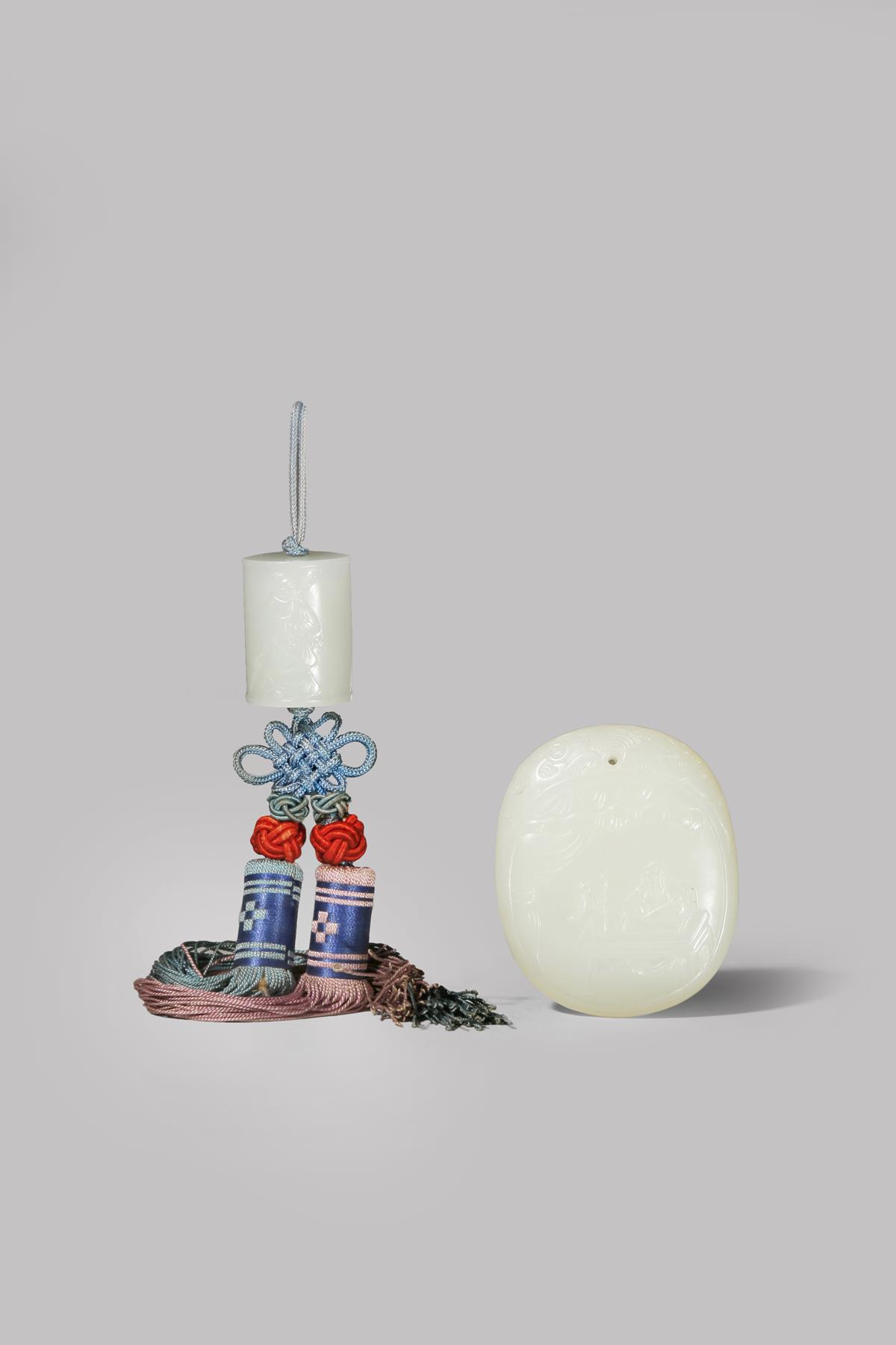 A CHINESE WHITE JADE OVAL PENDANT AND A CYLINDRICAL BEAD QING DYNASTY OR LATER The pendant carved...