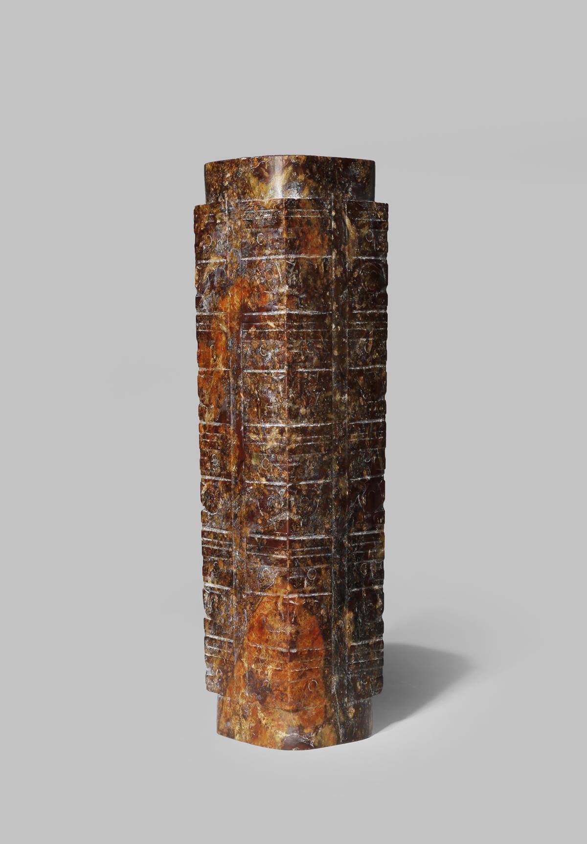 A CHINESE ARCHAISTIC BROWN STEATITE CONG IN LIANGZHU CULTURE STYLE Of tapering square-section form