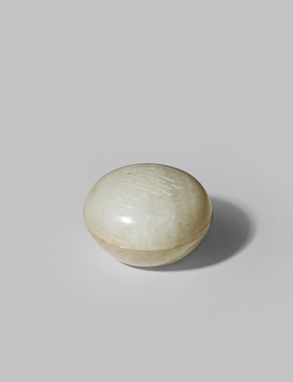 A CHINESE PALE CELADON JADE CIRCULAR BOX AND COVER QING DYNASTY The domed cover carved with a...