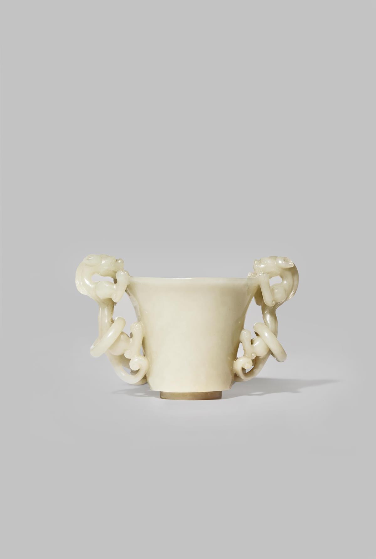 A CHINESE PALE CELADON JADE CUP 18TH/19TH CENTURY The flaring body carved to the exterior with...