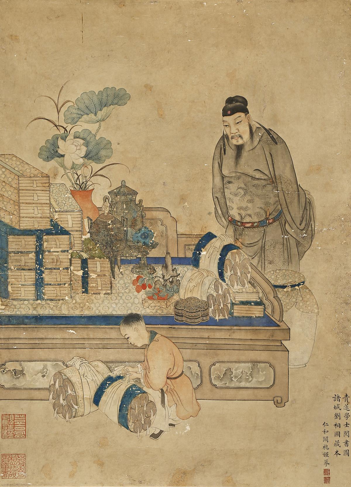 Depicting a scholar overseeing a small boy who is packing up scrolls and other treasures which have been placed upon a kang, with three columns of calligraphy and four red seal marks, 58cm x 43cm.