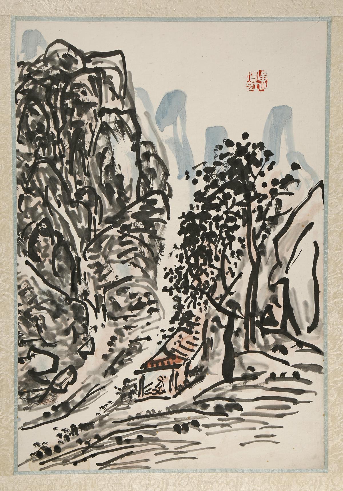 Depicting a small hut beneath trees surrounded by towering rocks and distant mountains, a single red seal mark, together with a sheet of calligraphy attributed to Xu Beihong, 36cm x 25cm. (2)