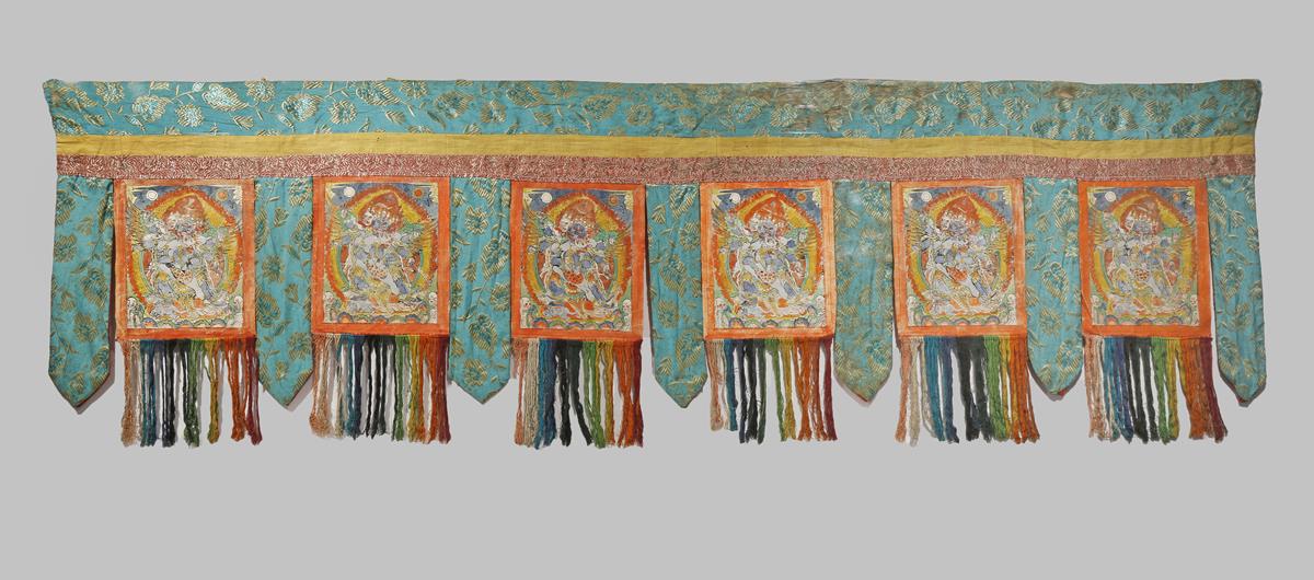 Decorated with six painted panels of deities divided by silk bands, mounted in perspex, 51cm x 179cm.