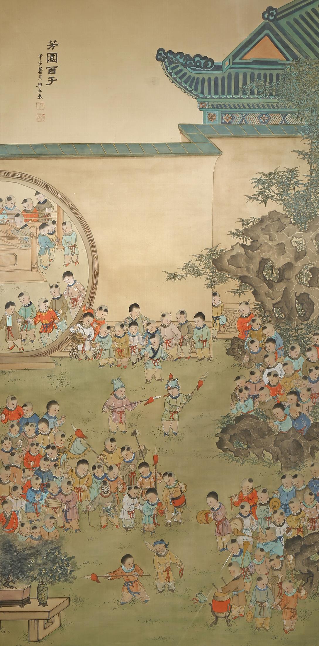 A LARGE CHINESE PAINTING ON SILK 20TH CENTURY Depicting many boys playing in a garden