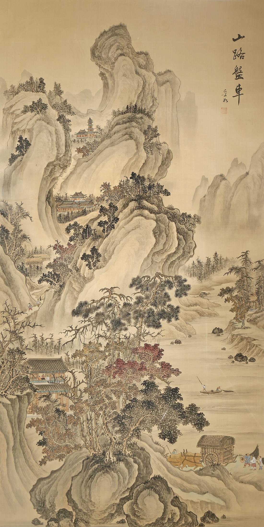 A LARGE CHINESE PAINTING ON SILK 20TH CENTURY Depicting figures in a mountainous landscape