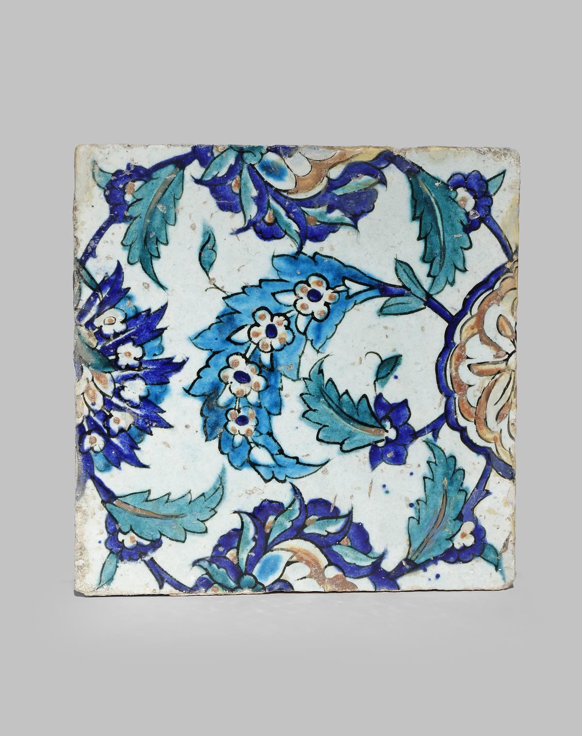 AN IZNIK POTTERY SQUARE TILE 16TH/17TH CENTURY Boldly decorated in blue
