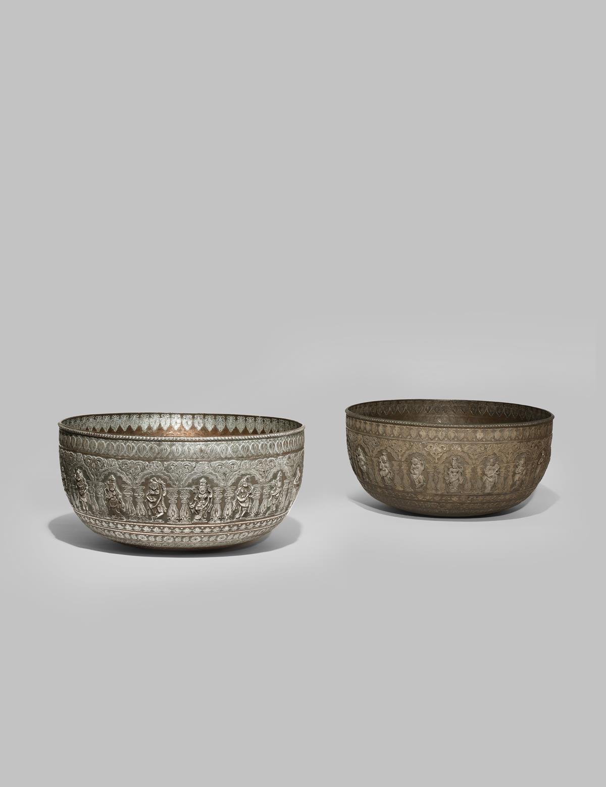 A MASSIVE PAIR OF INDIAN SILVER AND COPPER GUJARAT-STYLE BOWLS LATE 19TH CENTURY The exterior...