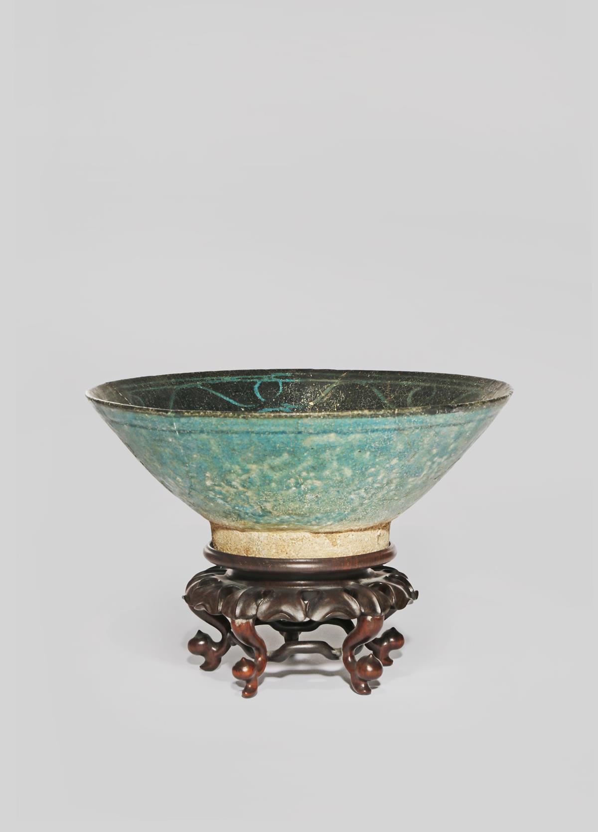 Of conical form and raised on a straight foot, the interior decorated in turquoise with a radiating petal design encircling a flower motif, reserved on a black slip ground, raised on a Chinese hardwood five-legged stand, 19.5cm. (2)