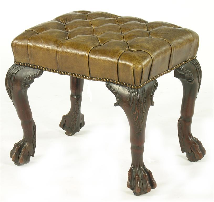 An 18th century Irish rectangular stool, the later button leather and brass studded top, on carved leaf and rocaille mahogany legs with waisted ankles to claw and ball feet on leather roller castors, 18.5in (47cm),