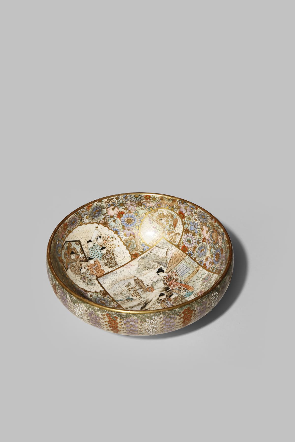 A SMALL JAPANESE SATSUMA BOWL MEIJI 1868-1912 Decorated with panels containing figures in a...