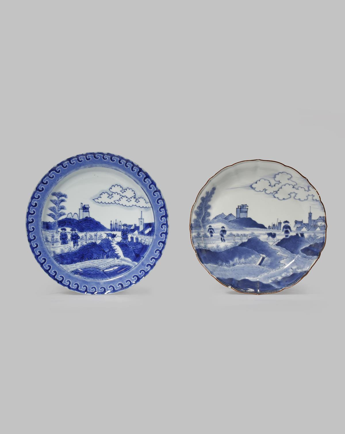 Painted with three Europeans in a landscape scene, one walking a dog, a tower on a hill in the distance, all contained within a wave border to the rim, together with a Japanese blue and white Arita dish of similar design, paper collection labels, 20cm max. (2)