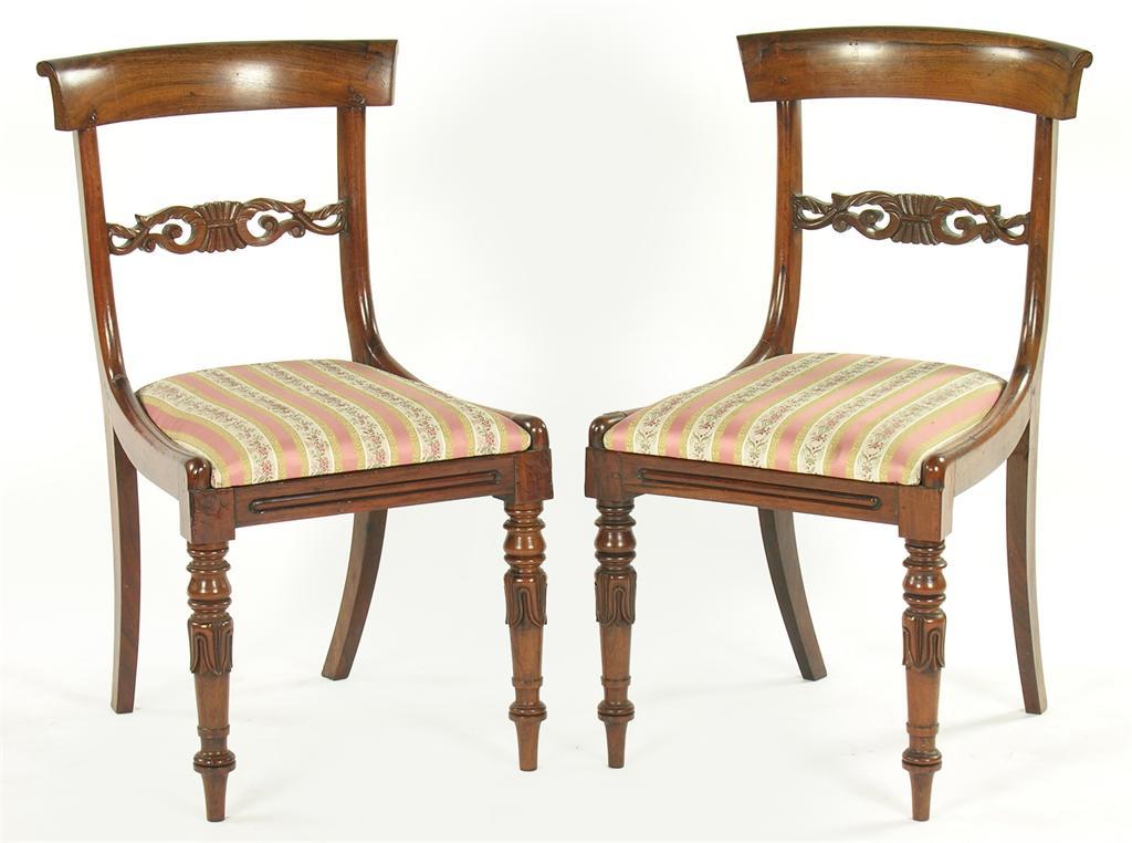 A set of five George IV rosewood side chairs, with drop in seats, old repairs. (5)