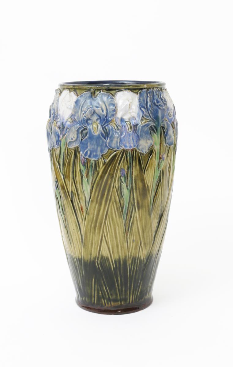 A Doulton Lambeth stoneware vase by Ethel Beard, flaring cylindrical form, cast in low relief with flag iris, glazed in shades of blue, green and white impressed marks, incised EB monogram, 37cm. high