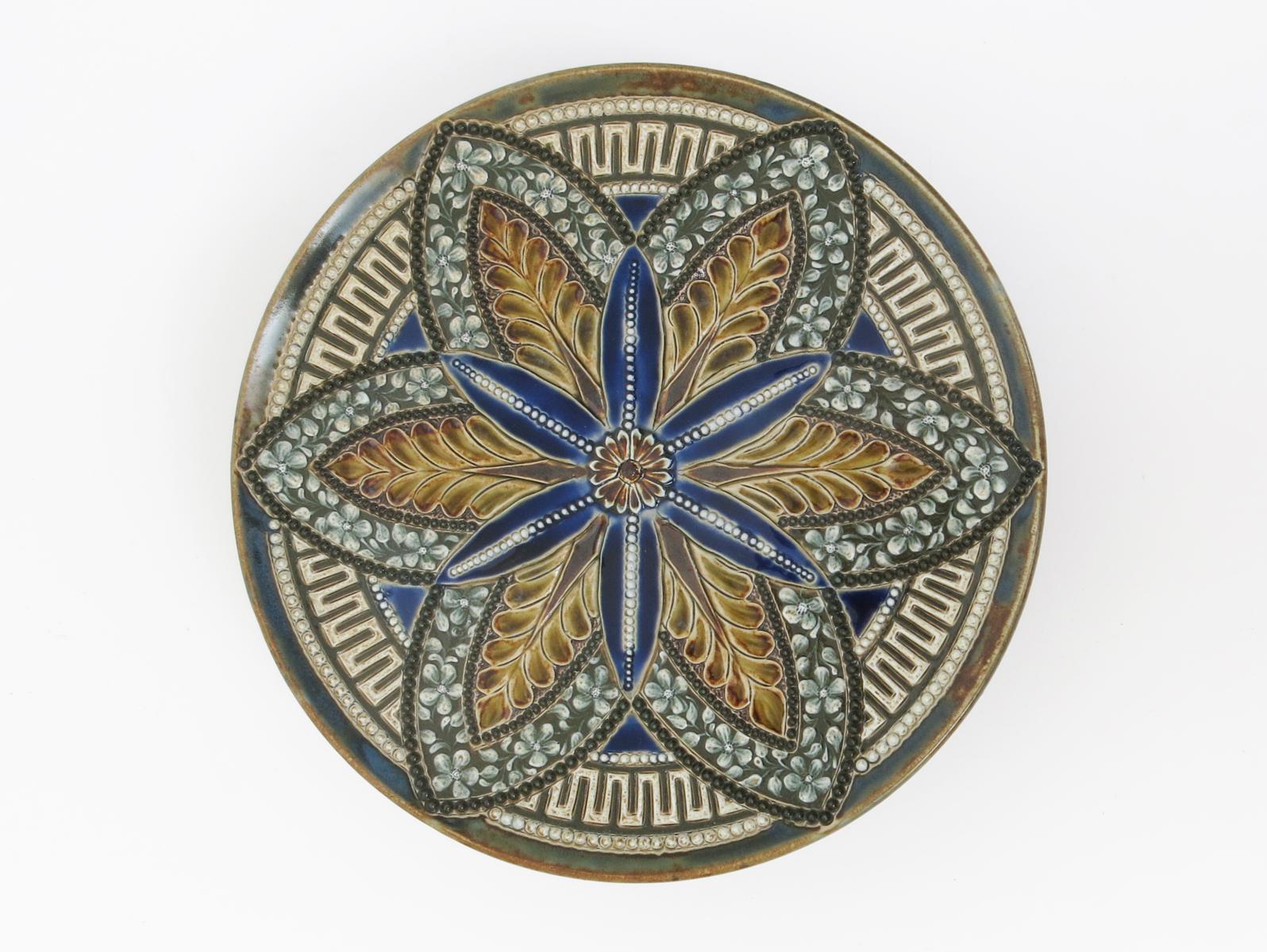 A Doulton Lambeth stoneware tazza by Francis Lee, dated 1886, incised with a radiating flower-head design with slip painted flowers and applied beadwork borders, in shades of ochre, green and blue on a buff ground, the exterior radiating foliage, impressed and incised artist monogram, 21.5cm. diam.