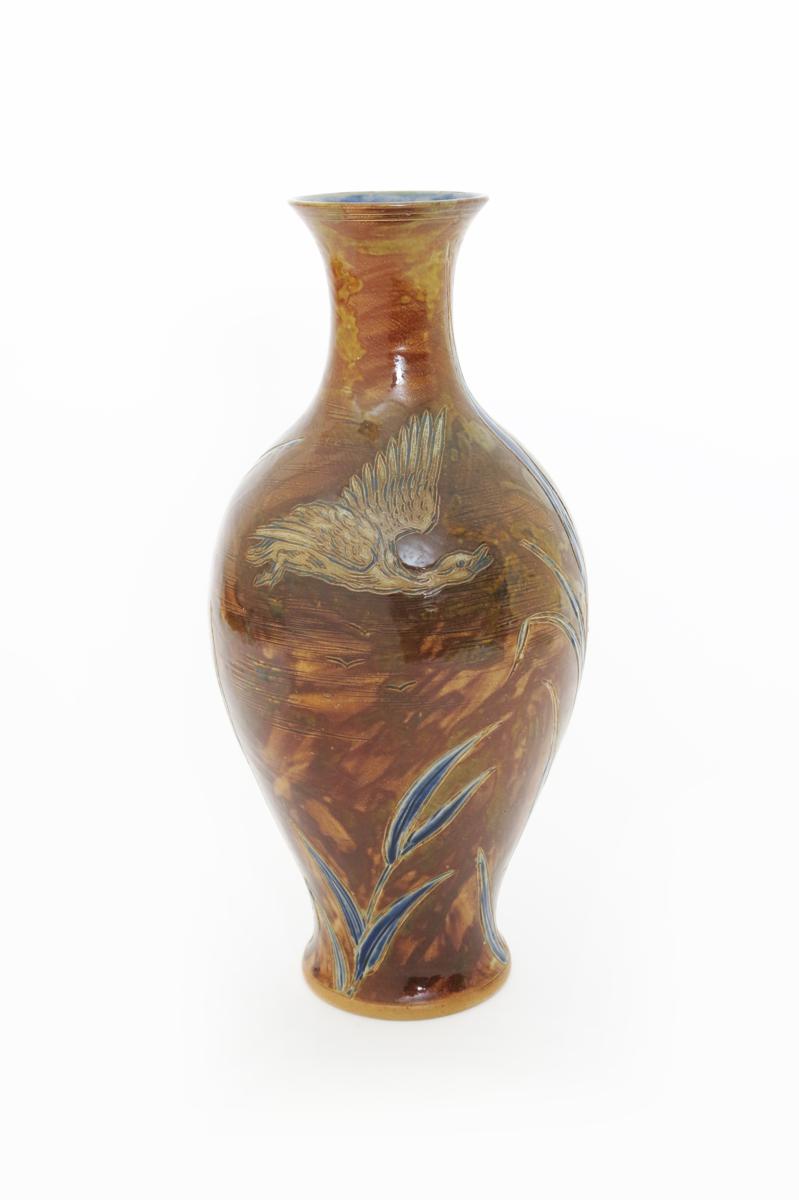 An early Doulton Lambeth stoneware vase by Hannah Barlow, dated 1873, incised a duck flying past large bulrush, in blue on a brown ground impressed mark, incised monogram 40cm. high
