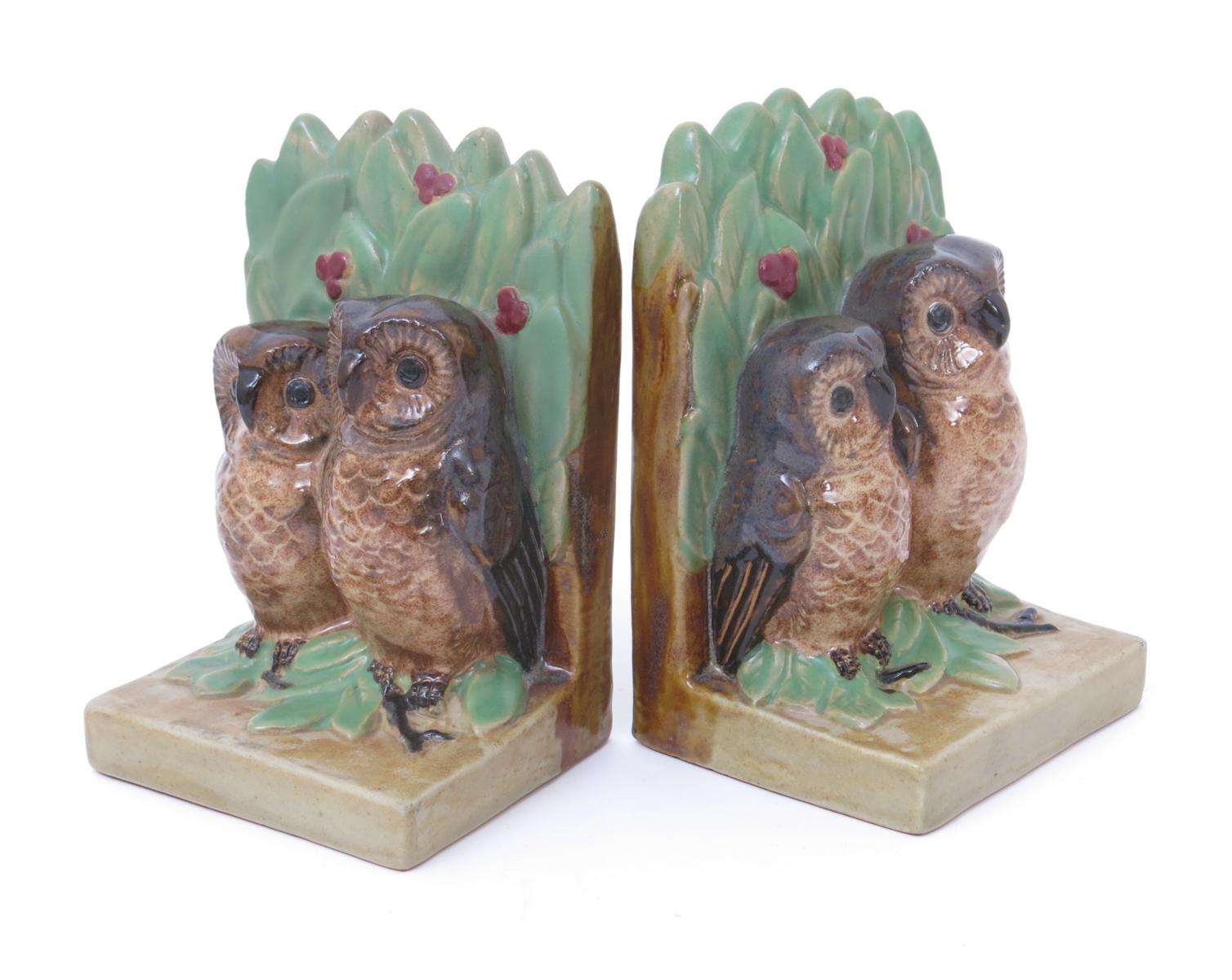 A pair of Doulton Lambeth stoneware book ends probably designed by Harry Simeon, each modelled as a pair of owls perched amongst berried foliage, glazed in colours impressed factory marks, minor professional restoration, 17cm. high