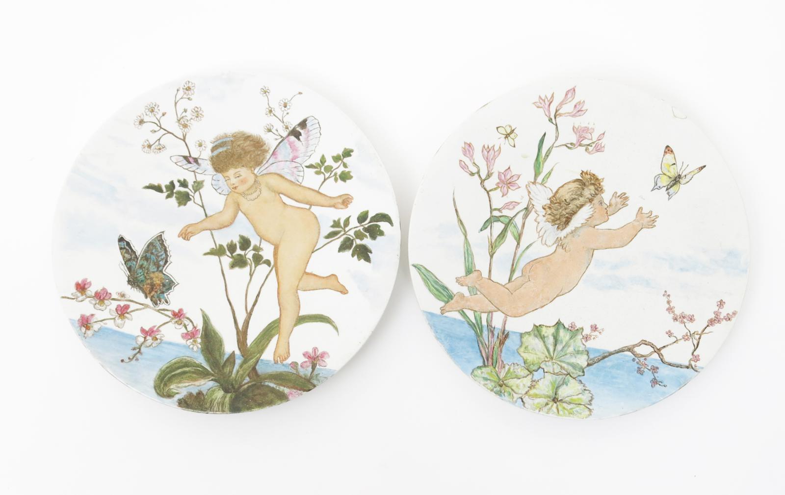 A pair of Minton's Pottery wall plaques the design attributed to W S Coleman, painted with cherubs and butterflies before an expanse of water, in colours on a pale blue ground, impressed marks, painted Mrs Harry to the reverse, repaired chip to rim of one 36cm. diam. (2)