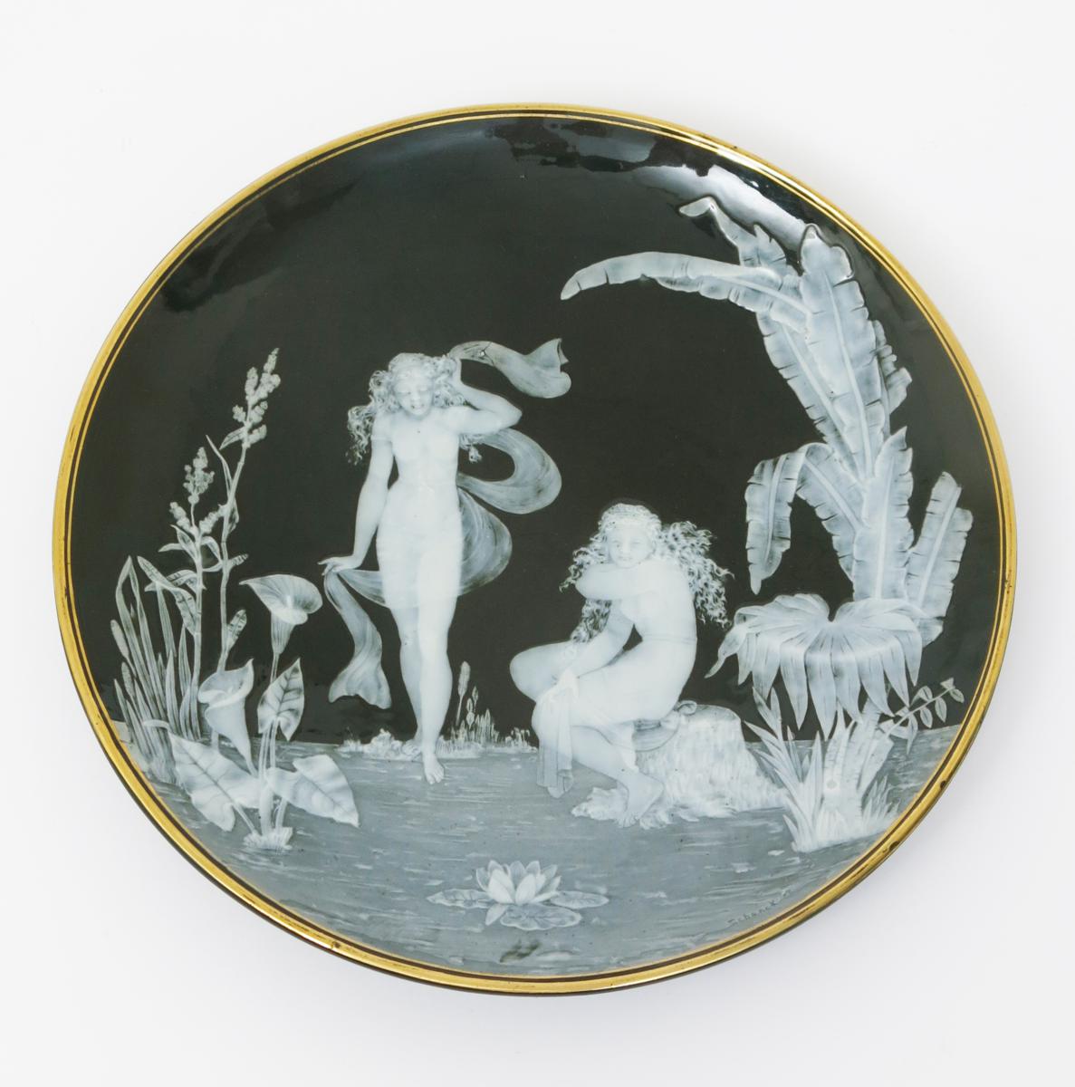 A George Jones pate sur pate wall plaque designed by Frederick Schenk, slip decorated with two young maidens raised above a large pond, with flowering Calla and water lillies, in white on a dark green ground, with gilt rim impressed factory marks, impressed Schenk signature to front rim, 30cm. diam.