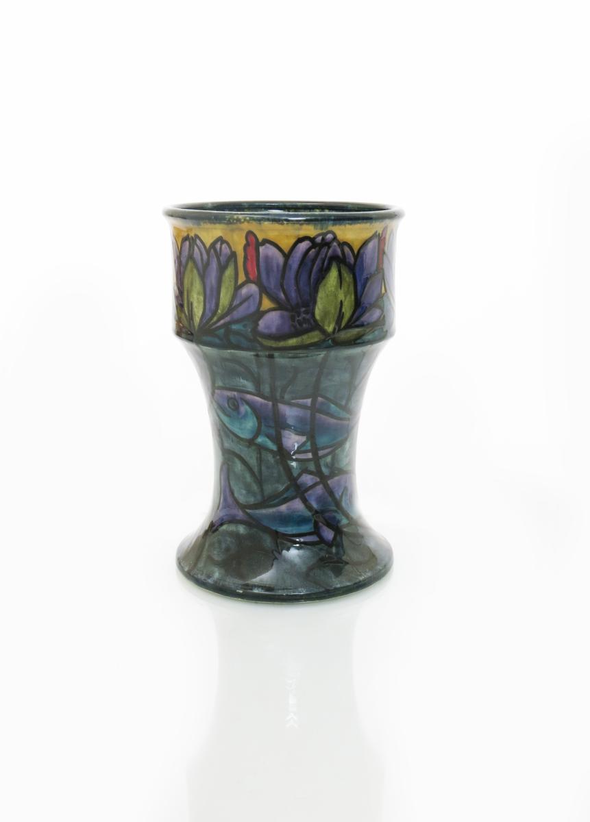 A rare Hancock & Sons Morris Ware vase designed by George Cartlidge, C78-1, slip decorated with fish swimming below water-lily flowers, in shades of purple, blue and green on a buff ground printed and painted marks, facsimile signature, 25cm. high