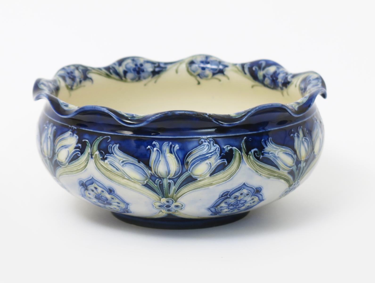'Tulip' a James Macintyre & Co Florian Ware bowl designed by William Moorcroft, with fluted top rim, tubeline decorated with panels of flowers, in blue and green on a pale blue ground printed factory mark, painted green signature, 17.5cm. diam.