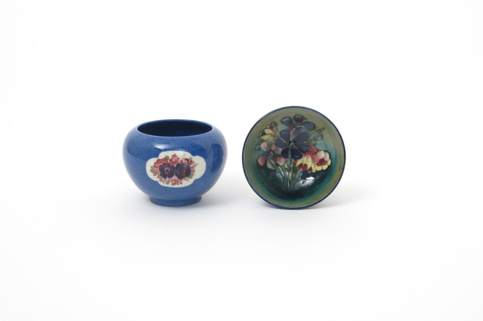 A Moorcroft Pottery vase designed by William Moorcroft, footed ovoid form, tubeline decorated with floral panel in colours on a powder blue ground, and a Moorcroft Springflowers bowl impressed marks painted green signature, 8.5cm. high, (2).
