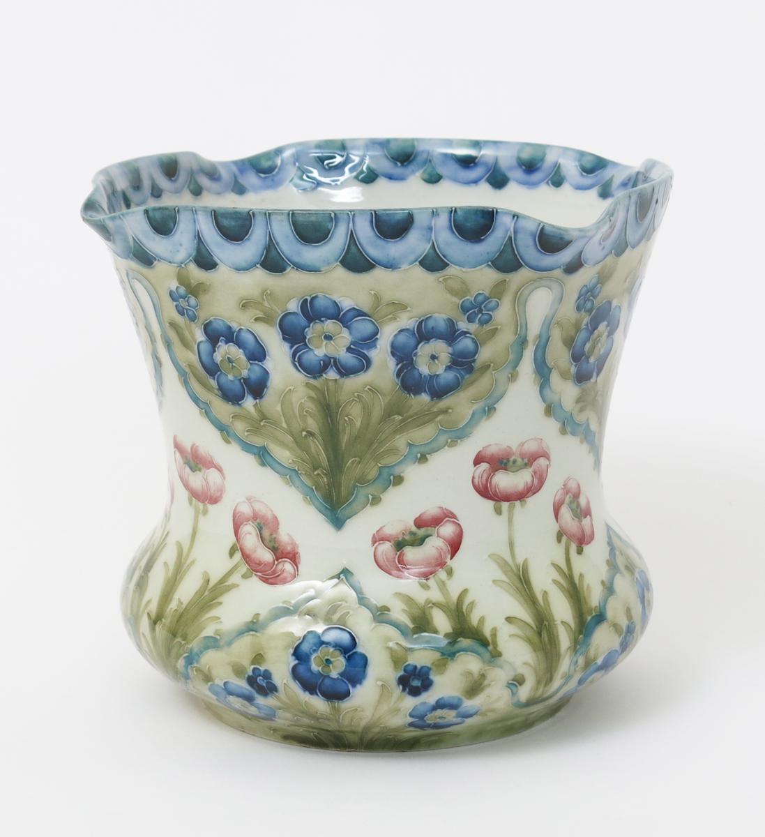 A James Macintyre vase designed by William Moorcroft, compressed form with flaring cylindrical neck and pinched rim, tubeline decorated with panels of flowers and foliage in pink, blue and green on a white ground printed factory mark, painted green signature, 16cm. high