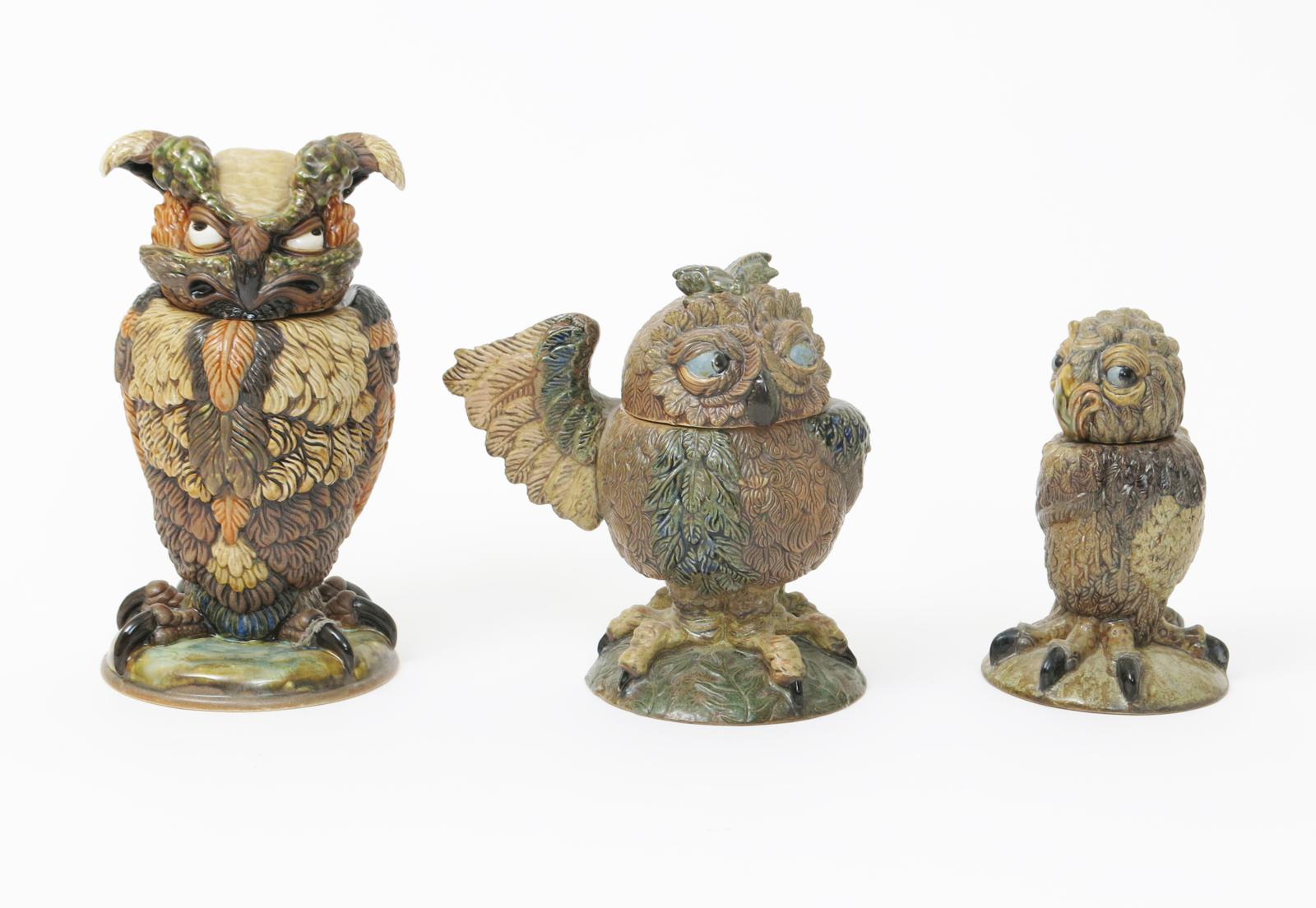 Oswald the Owl an Andrew Hull Pottery stoneware limited edition owl jar and cover, glazed in colours, and Rosy and Octavia two other Andrew Hull owl bird jar and covers, impressed marks, AW monogram, 4/65, 26cm. high, (3)