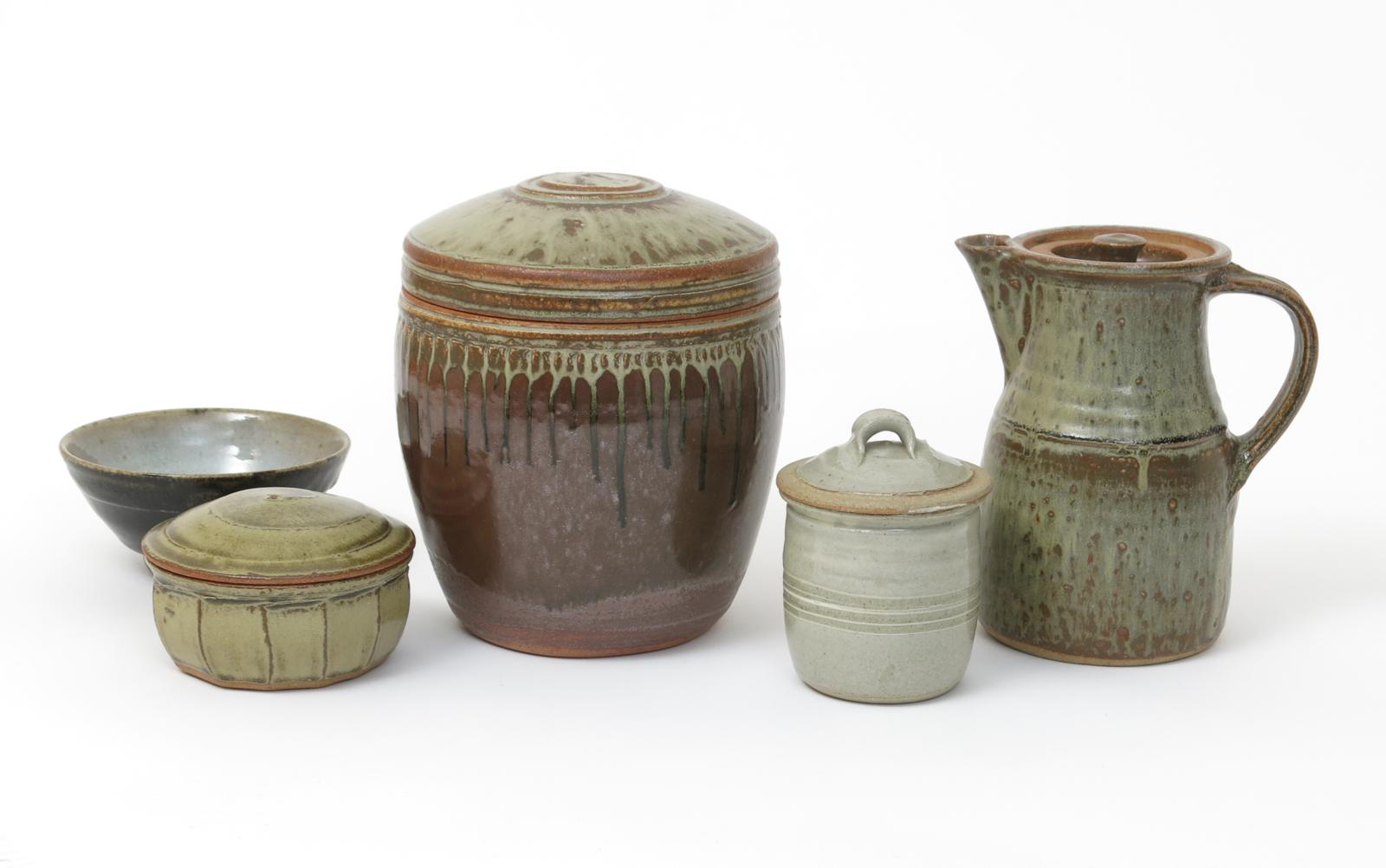 a stoneware jar and cover, covered to the foot with a running ash and tenmoku glaze, a covered jug, two covered bowls and five bowls unsigned, 25cm. high (9)
