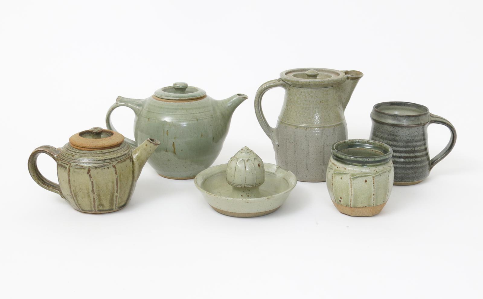 a cut-sided stoneware teapot and cover, covered in an ash glaze, a pedestal bowl and a collection of studio pottery including Svend Bayer and Richard Batterham, unmarked, 12cm. high (a lot)
