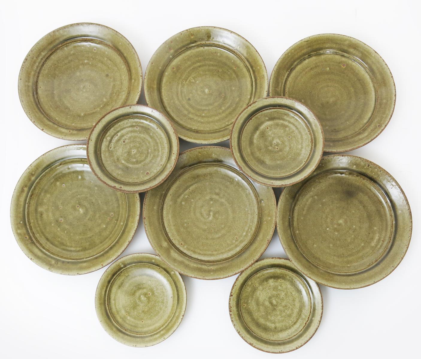a stoneware service, comprising, twelve dinner and side plates, covered in ash glaze unsigned,dinner plates 26.5cm. diam, side plates 18.5cm. diam.