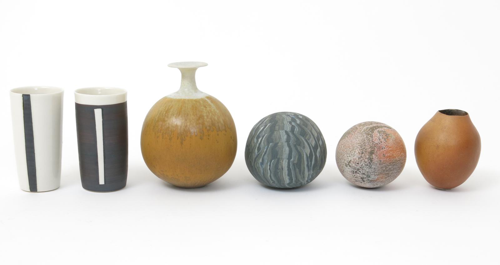 a hand-built ceramic orb, covered in a burnished glaze, another raku orb by Elspeth Owen, a stoneware unomi by Yo Thom and a collection of studio pottery including Chris Keenan, Sheila Fournier, Daniel Smith and Tessa Fuchs various marks, 9cm. high (16).