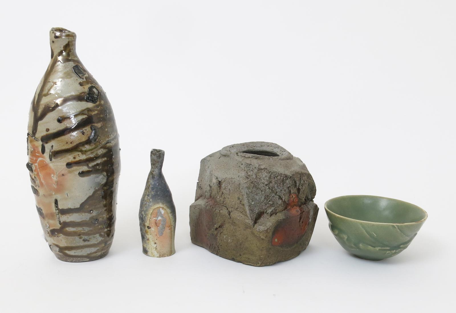 a salt-glaze stoneware bottle vase, slender form with poured ash glaze, glaze imperfections and kiln kisses in the finish, another solifleur vase by John MacKenzie, a stoneware vase by Herve Rousseau, a square dish by Pascal Geoffrey, a bowl by Jean-Francois Foullhoux and five other dishes impressed seal marks, 35cm. high (10)