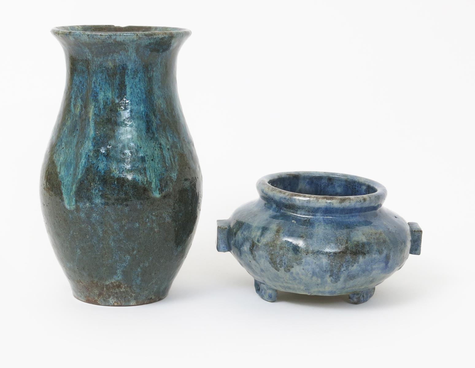 a Soon stoneware twin-handled vase, dated 1915, low compressed form on three feet, with two lug handles, covered in a thick running blue and green glaze over purple flambe, and another Soon vase by Reginald Wells, incised Soon 15, minor chips, 18cm. wide, (2)