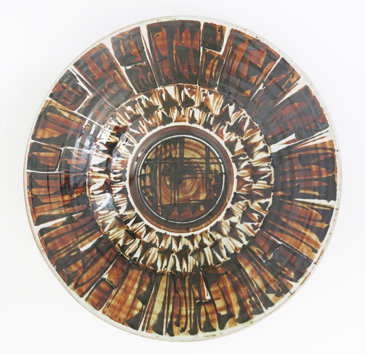 an early Aldermaston Pottery tin-glazed wood-fired charger, circa 1966, painted with geometric bands in brown and black on a pale grey ground painted monogram and date code, 45cm. high