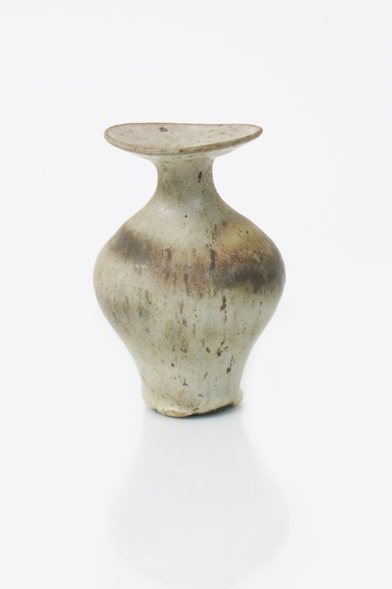 a stoneware vase, swollen form with flaring neck, covered to the foot with a streaked matt mushroom and ochre glaze, impressed seal mark, 17cm. high