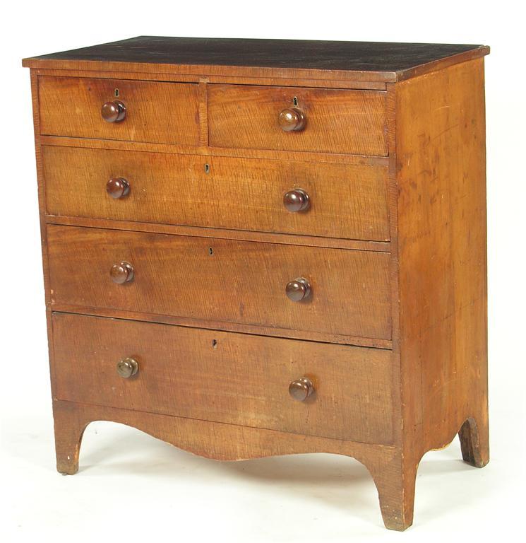 A Victorian mahogany small chest, the fiddleback front fitted turned handles one drawer inscribed 'J.P.Rogors, April 5, 1841', pine sides, 39.25in (99.5cm) h, 36.75in (93.2cm) w, 20.25in (51.4cm) d.