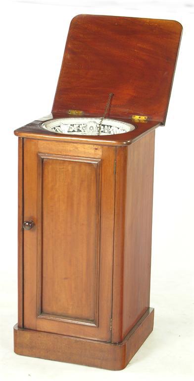 A Victorian mahogany pedestal washstand, the hinged top to an inset ceramic basin with a brass plug, the door enclosing a shelf, 31in (78.7cm) h, 16.5in (42cm) w, 15in (38cm) d.