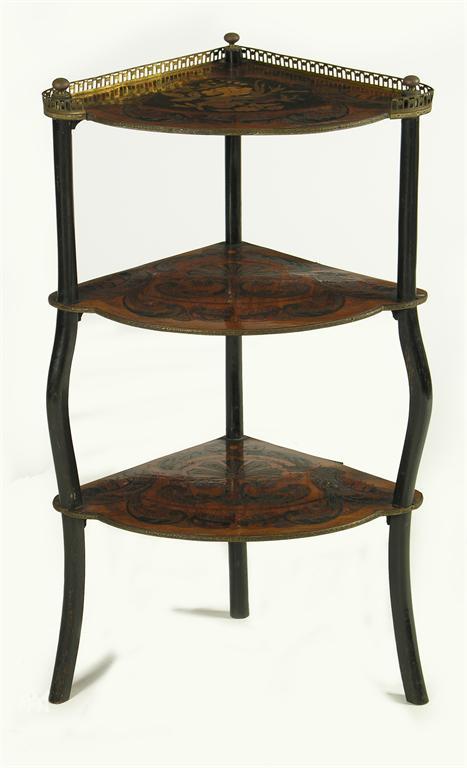 A late 19th century inlaid corner etagere, with gilt brass mounts and ebonised supports, 30.25in (76.7cm) h, 17.5in (44.4cm) w, 13.5in (34.2cm) d.