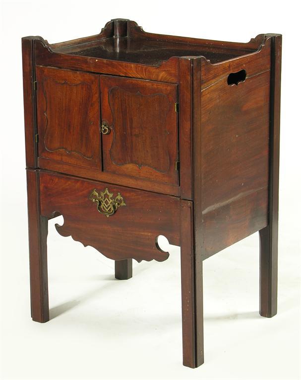 A George III mahogany bedside commode, the supports previously rondel capped, the pull out base, converted to a shallow drawer, 32in (81.2cm), 22.25in (56.5cm) h, 17in (43.2cm) d.
