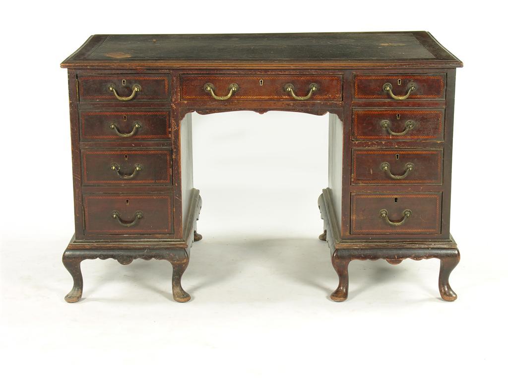 A mahogany twin pedestal desk, inlaid chevron banding, the leather inset top above a frieze drawer, a cupboard door, a fitted deep drawer and two short drawers, the brass locks stamped 'HOBBS & CO', on cabriole legs, 30.5in (77.5cm) h, 48in (122cm) d, 27in (68.5cm) d.